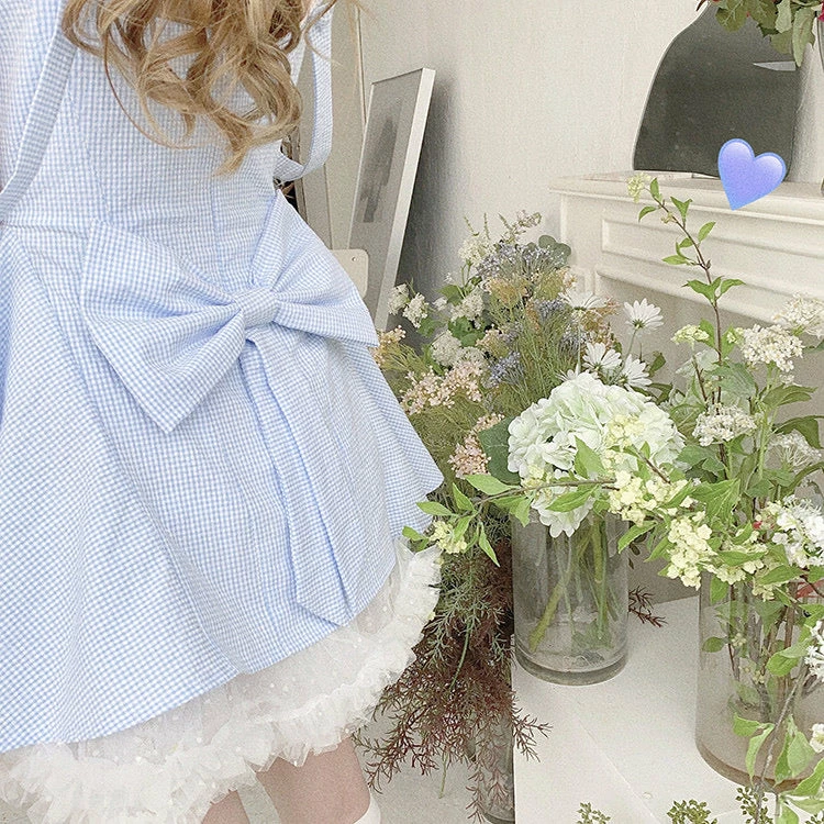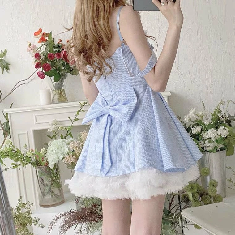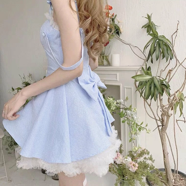 EverythingCuteClub Cloud Blue Dress With White Mesh Skirt Dress + Rompers
