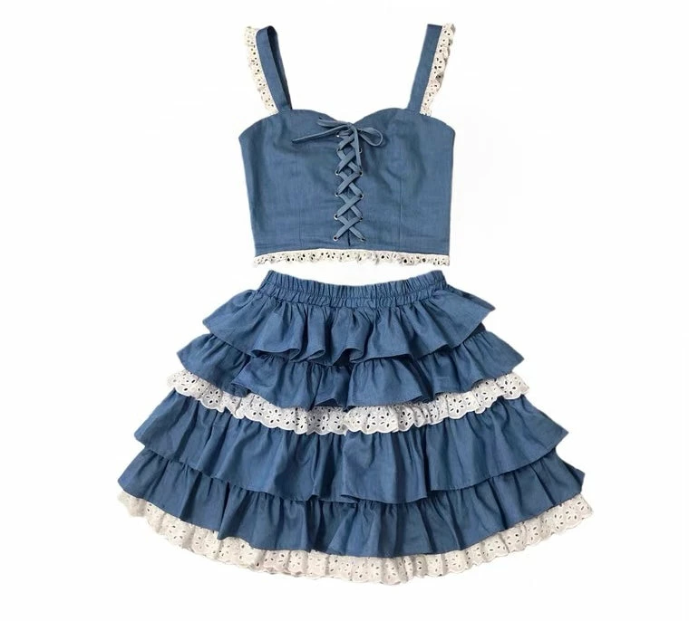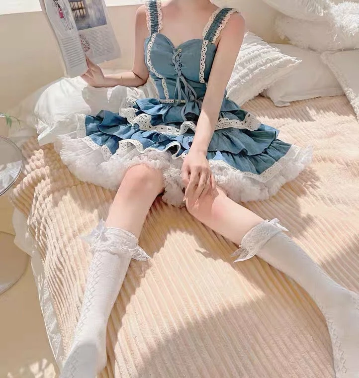 The fabric of Lolita style is denim. And the hem is bigger so you can wear panier drawer (bustle skirt) underneath.Â